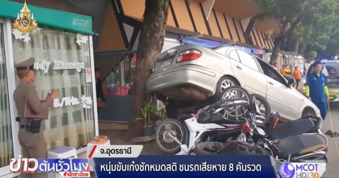 หนุ่มขับเก๋งจะมาร้านนวดกลางเมืองอุดรธานี เกิดอาการชักหมดสติ ก่อนถอยหลังชนรถเสียหาย 8 คัน