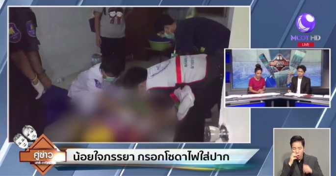 หนุ่มชาวลาวน้อยใจภรรยา หลังถูกด่าเรื่องกินเหล้าไม่สนใจเมียท้อง คว้าโซดาไฟกรอกปากดิ้นต่อหน้าเมีย