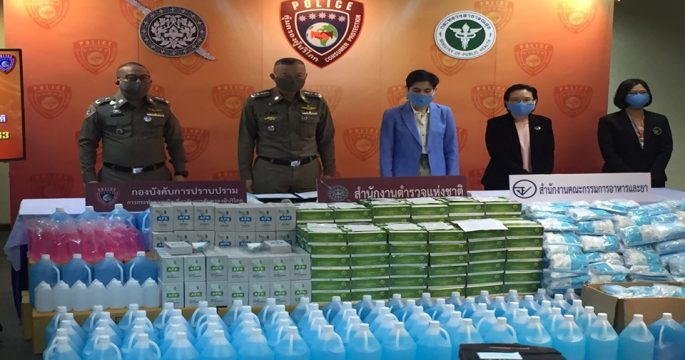 ตำรวจปคบ. ร่วม อย. จับผู้กักตุนหน้ากากอนามัย ลักลอบผลิตเจลแอลกอฮอล์ มูลค่า 50 ล้านบาท