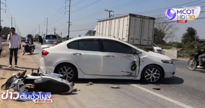 เกิดเหตุรถจักรยานยนต์พุ่งชนรถยนต์ หน้าปั๊มแก๊สบนถนนสุขุมวิทสายเก่า อ.บางปะกง จ.ฉะเชิงเทรา คนขี่รถจักรยานยนต์กระเด็นลอยข้ามรถยนต์ ศีรษะกระแทกพื้นอาการสาหัส