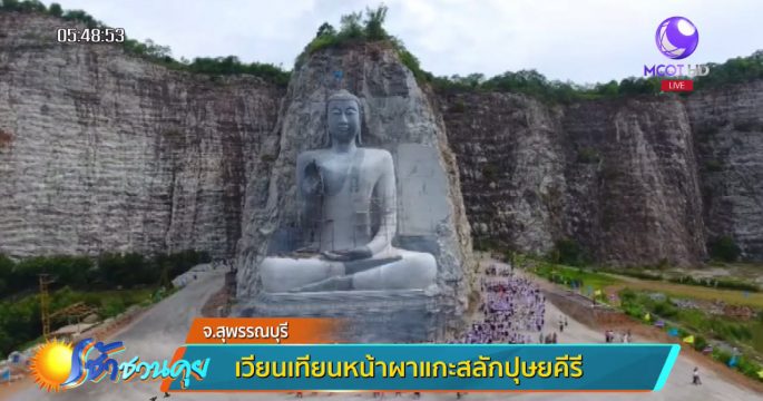 ชาวสุพรรณบุรีร่วมใจเดินเวียนเทียนลอดอุโมงค์หน้าผาแกะสลักพระใหญ่ “พระพุทธปุษยคีรีศรีสุวรรณภูมิ” เนื่องในเทศกาลวันวิสาขบูชา