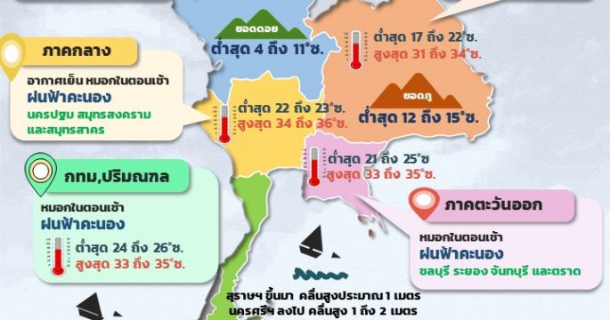 อุตุฯ เผยไทยตอนบนมีหมอกในตอนเช้า ภาคเหนือ-อีสานอากาศเย็นถึงหนาว อุณหภูมิต่ำสุด 13-22 องศาฯ ยอดดอยและยอดภูมีอากาศหนาวถึงหนาวจัด อุณหภูมิต่ำสุด 4-16 องศาฯ ส่วนภาคกลาง ภาคตะวันออก และภาคใต้ รวมทั้งกรุงเทพฯ และปริมณฑล มีฝนฟ้าคะนองเกิดขึ้นในระยะนี้