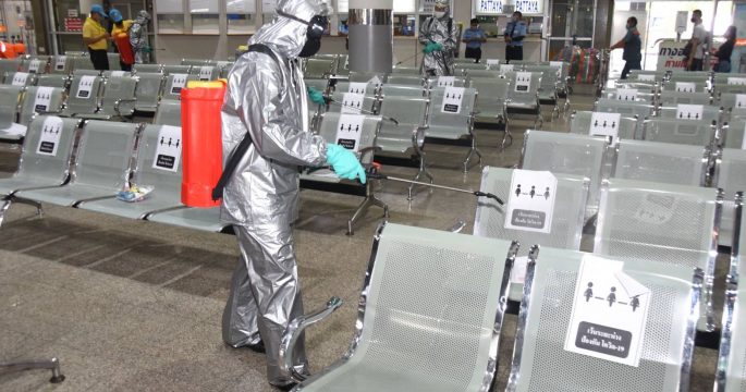 กองทัพบกส่งหน่วยเฉพาะกิจฉีดพ่นน้ำยาฆ่าเชื้อโรคภายในสถานีขนส่งหมอชิต 2