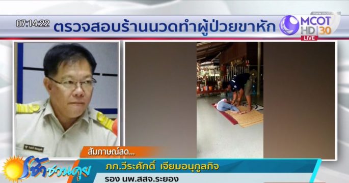คดีสาวใหญ่แจ้งความเอาผิด “หมอปั๊ก” อ้างเข้าไปนวดรักษา และถูก “หมอปลื้ม” เหยียบเส้นจนขาหัก ตำรวจ สภ.เมืองระยอง เข้าตรวจสอบบ้าน “หมอปั๊ก” พบยังปิดเงียบ ตัว “หมอปั๊ก” นอนอยู่ไอซียู เพราะเครียดจากเรื่องที่เกิดขึ้น ส่วน “หมอปลื้ม” ติดต่อไม่ได้
