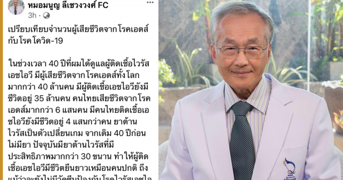 กทม.9 ส.ค.-“หมอมนูญ” โพสต์เปรียบเทียบจำนวนผู้เสียชีวิตจากโรคเอดส์กับโรคโควิด-19 พร้อมชี้ตัวเปลี่ยนเกมลดอัตราตายของโรคโควิดคือวัคซีน ไม่ว่ายี่ห้อไหน ลดป่วยหนัก-เสียชีวิตได้ 10 เท่าเมื่อเทียบกับคนไม่ได้รับวัคซีน แนะคนไทยอย่ากังวล เครียดมากเกินไป ต้องยอมรับและเรียนรู้อยู่กับโรคโควิด ถึงแม้จะมีคนไข้ใหม่เสียชีวิตเพิ่มขึ้นอย่างต่อเนื่องในระยะนี้ก็ตาม นพ.มนูญ ลีเชวงวงศ์ หัวหน้าโรคระบบทางเดินหายใจ โรงพยาบาลวิชัยยุทธ โพสต์ข้อความผ่านเฟซบุ๊ก “หมอมนูญ ลีเชวงวงศ์ FC” เปรียบเทียบจำนวนผู้เสียชีวิตจากโรคเอดส์กับโรคโควิด-19 ในช่วงเวลา 40 ปีที่ผมได้ดูแลผู้ติดเชื้อไวรัสเอชไอวี มีผู้เสียชีวิตจากโรคเอดส์ทั้งโลกมากกว่า 40 ล้านคน มีผู้ติดเชื้อเอชไอวียังมีชีวิตอยู่ 35 ล้านคน คนไทยเสียชีวิตจากโรคเอดส์มากกว่า 6 แสนคน มีคนไทยติดเชื้อเอชไอวียังมีชีวิตอยู่ 4 แสนกว่าคน ยาต้านไวรัสเป็นตัวเปลี่ยนเกม จากเดิม 40 ปีก่อนไม่มียา ปัจจุบันมียาต้านไวรัสที่มีประสิทธิภาพมากกว่า 30 ขนาน ทำให้ผู้ติดเชื้อเอชไอวีมีชีวิตยืนยาวเหมือนคนปกติ ถึงแม้ว่าจะยังไม่มีวัคซีนป้องกันโรคไวรัสเอชไอวีก็ตาม โรคโควิด-19 ตั้งแต่เริ่มมีการระบาด จำนวนคนเสียชีวิตทั้งโลก 4.3 ล้านราย จำนวนผู้ติดเชื้อไวรัสโควิด-19 สะสม 203 ล้านคน อัตราการเสียชีวิต […]