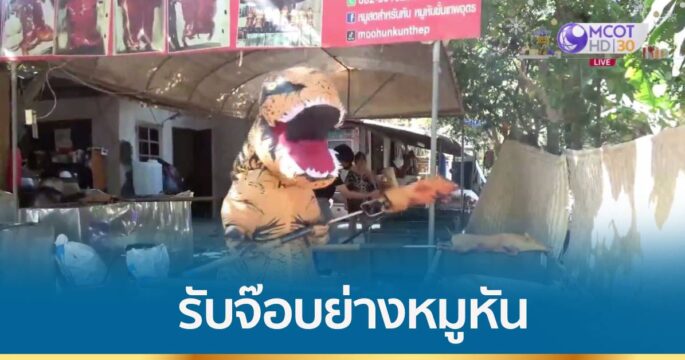 หมูหันขายดีปีใหม่ งัดกลยุทธ์ดึงดูดลูกค้า ใส่ชุดไดโนเสาร์ย่างขาย