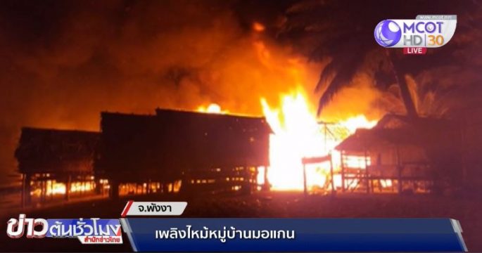เพลิงไหม้ ในหมู่บ้านมอแกน บริเวณอ่าวบอน จ.พังงา ยังไม่สามารถควบคุมเพลิงได้ และยังไม่ได้รับรายงานว่ามีผู้บาดเจ็บ หรือเสียชีวิต