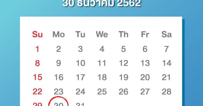 ธปท.กำหนดให้วันที่ 30 ธันวาคม 2562 เป็นวันทำการตามปกติของสถาบันการเงินและสถาบันการเงินเฉพาะกิจ
