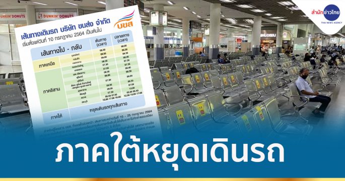 บขส. ประกาศหยุดเดินรถเส้นทางภาคใต้ทุกเส้นทาง ส่วนภาคเหนือ – อีสาน เปิดให้บริการรวม 13 เส้นทาง เริ่ม 10 ก.ค. เป็นต้นไป ผู้โดยสารที่จองตั๋วล่วงหน้าระหว่าง 10 – 25 กรกฎาคม 2564 ขอคืนตั๋วได้เต็มราคา ไม่หักค่าธรรมเนียม