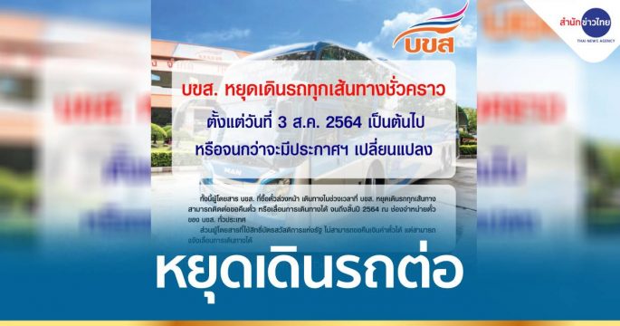 บขส.แจ้งหยุดเดินรถทุกเส้นทางชั่วคราว ตั้งแต่วันที่ 3 ส.ค.64 เป็นต้นไป จนกว่าจะมีประกาศคำสั่งเปลี่ยนแปลง