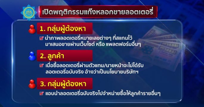 ตำรวจ ปคบ.บุกจับกุมเครือข่ายหลอกขายลอตเตอรี่ให้ผู้บริโภค โดยจะเปิดขายผ่านระบบออนไลน์ แต่ผู้ซื้อไม่ได้ลอตเตอรี่แม้แต่ใบเดียว