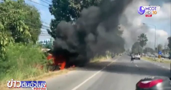 เจ้าหน้าที่ระดมฉีดน้ำดับเพลิงที่โหมลุกไหม้รถยนต์อย่างรุนแรง บริเวณปากซอยนาจอมเทียน 52 ใกล้กับโรงเรียนบ้านหินวง ต.นาจอมเทียน ขาเข้าพัทยา หลังประสบอุบัติเหตุเสียหลักพุ่งชนต้นไม้อย่างแรง ก่อนที่จะเกิดไฟลุกไหม้ขึ้น