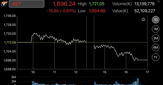 หุ้นไทยร่วงแรงกว่า 15 จุด หลุด 1,700 จุด เจอแรงขายกลุ่มพลังงาน-ปิโตรเคมี