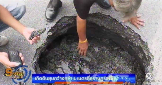 เกิดดินยุบเป็นหลุมขนาดใหญ่กว้างกว่า 1 เมตร ลึกกว่า 70 เซนติเมตร กลางถนนในเขตเทศบาลนครสุราษฎร์ธานี เจ้าหน้าที่ต้องปิดการจราจรชั่วคราวเพื่อป้องกันอุบัติเหตุ