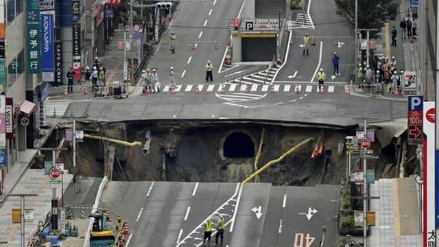 ตำรวจญี่ปุ่นกำลังตรวจสอบหลุมยุบขนาดใหญ่บนถนนในย่านการค้าของเมืองฟูกูโอกะ ทางตะวันตกเฉียงเหนือของเกาะคิวชู ซึ่งเป็นเกาะทางใต้ของประเทศในช่วงเช้าวันนี้