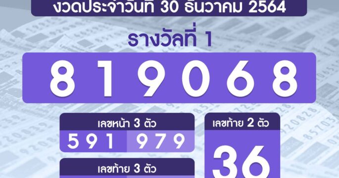 ผลรางวัลสลากกินแบ่งรัฐบาล งวดวันที่ 30 ธันวาคม 2564
