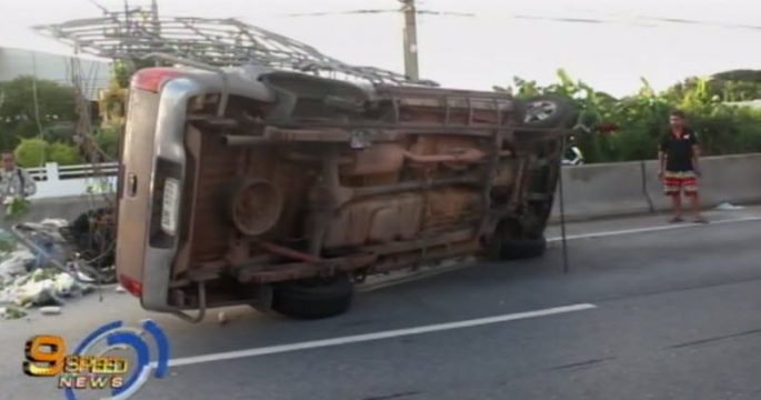 รถกระบะบรรทุกหัวไชเท้าเต็มคัน เพลาขาดล้อหลุดพลิกคว่ำขวางถนนพหลโยธิน ขาเข้าช่องทางด่วน ต.คลองหนึ่ง อ.คลองหลวง จ.ปทุมธานี