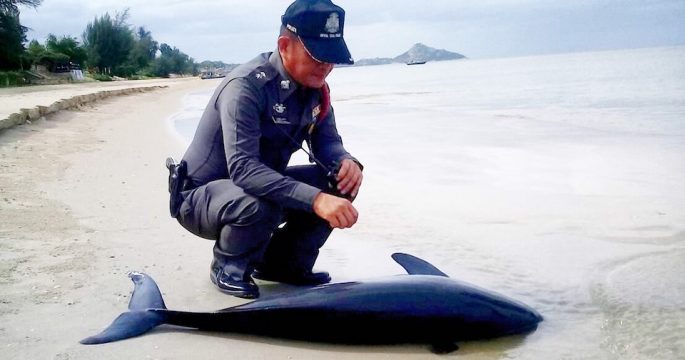 ประจวบคีรีขันธ์ 3 ส.ค.- จนท.เก็บซากโลมาเกยหาดบ้านเขาเต่า-หัวหิน สภาพขึ้นอืด ส่งให้ศูนย์วิจัยฯ ชายฝั่งอ่าวไทยตอนกลางพิสูจน์หาสาเหตุ เมื่อเวลา 17.00 น. ( 3 ส.ค.) ศูนย์วิทยุรับแจ้งเหตุ 191 สภ.หัวหิน จ.ประจวบคีรีขันธ์ รับแจ้งจากประชาชนพบซากโลมาบริเวณชายหาดบ้านเขาเต่า อ.หัวหิน จึงประสานสายตรวจตู้ยามบ้านเขาเต่า และมูลนิธิสว่างหัวหินธรรมสถานเข้าตรวจสอบ เป็นโลมาไม่ทราบเพศ อายุประมาณ 1 ปี ขนาดตัวกว้าง 30 ซม. ยาว 1.10 เมตร สภาพเริ่มขึ้นอืด มีเลือดออกทางปากและช่องท้อง ลำตัวไม่บาดแผล คาดว่าตายแล้ว 1 วัน ส่วนสาเหตุอาจว่ายมาติดอวนเรือประมงช่วงมรสุมคลื่นลมแรง หรืออาจกินขยะพลาสติก ซึ่งเจ้าหน้าที่ได้เก็บซากส่งไปที่โรงพยาบาลสัตว์ มหาวิทยาลัยเกษตรศาสตร์หัวหิน เพื่อรอเจ้าหน้าที่จากศูนย์วิจัยและพัฒนาทรัพยากรทางทะเลและชายฝั่งอ่าวไทยตอนกลาง จ.ชุมพร มาตรวจสอบหาสาเหตุ.-สำนักข่าาวไทย