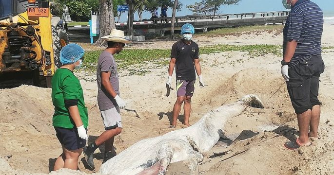 จนท.ศูนย์วิจัยฯ ชายฝั่งอ่าวไทยตอนล่าง พิสูจน์ซากวาฬ 2 ตัว เกยหาดสมิหลา คาดสาเหตุเจ็บป่วยและถูกคลื่นซัดเข้าฝั่ง