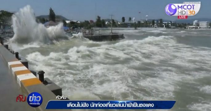 นักท่องเที่ยวบางส่วนไม่สนใจธงแดง ลงเล่นน้ำชายหาดหัวหิน ขณะที่เจ้าหน้าที่ขอความร่วมมือให้งดการเล่นกีฬาทางน้ำทุกประเภท หลังคลื่นลมแรง