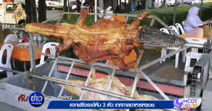 เมืองหาดใหญ่จัดเมนูจระเข้หัน 3 ตัว ย่างสดๆ แจกให้นักท่องเที่ยวกินฟรี ในเทศกาลอาหารหรอย ผลไม้อร่อยและของดีเมืองใต้ คนเข้าแถวยาวรอกินเนื้อจระเข้ครั้งแรก