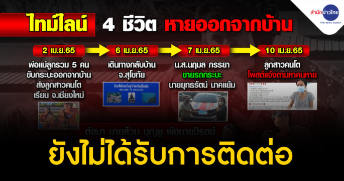 ยังเป็นปริศนา! กรณีพ่อแม่ลูก 4 ชีวิต หายตัวไปจากบ้านที่ จ.สุโขทัย ตั้งแต่วันที่ 10 เม.ย. ล่าสุดพบรถกระบะถูกขายต่อที่เต็นท์รถมือสองใน จ.อุดรธานี แต่ยังไร้วี่แววของทั้ง 4 คน ตำรวจเร่งแกะรอยตามหา ด้านลูกสาวคนโตยืนยันยังติดต่อไม่ได้ หวั่นพ่อแม่และน้องจะเป็นอันตราย