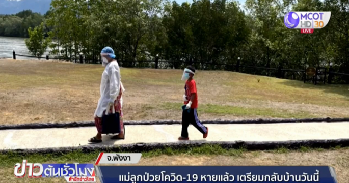แม่และลูกชายวัย 8 ขวบ ผู้ป่วยโควิด-19 รายแรกของ จ.พังงา ซึ่งเข้ารักษาตัวใน รพ.พังงา ตั้งแต่วันที่ 9 เม.ย. หายป่วยเป็นปกติแล้ว เจ้าหน้าที่เตรียมส่งกลับบ้านที่เกาะยาวใหญ่ วันนี้