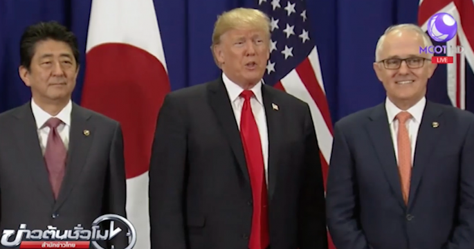 ประธานาธิบดีโดนัลด์ ทรัมป์ ของสหรัฐฯ พร้อมด้วยนายกรัฐมนตรีชินโซ อาเบะ ของญี่ปุ่น และนายกรัฐมนตรีมัลคอล์ม เทิร์นบุล ของออสเตรเลีย ได้พบหารือนอกรอบการประชุมสุดยอดผู้นำอาเซียน