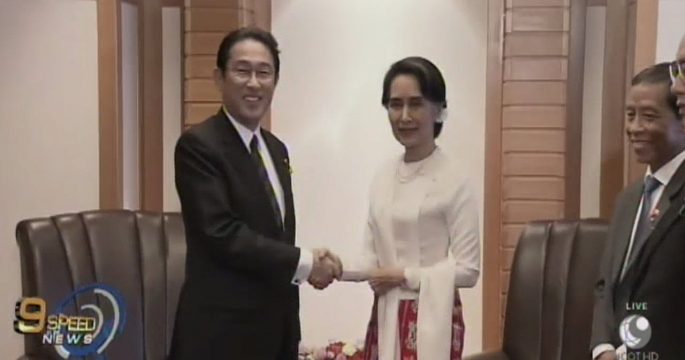 างอองซาน ซูจี มนตรีแห่งรัฐและรัฐมนตรีต่างประเทศเมียนมาร์ และรัฐมนตรีต่างประเทศญี่ปุ่น ร่วมหารือกันที่กรุงโตเกียว ถึงปัญหาเหตุรุนแรงในรัฐยะไข่