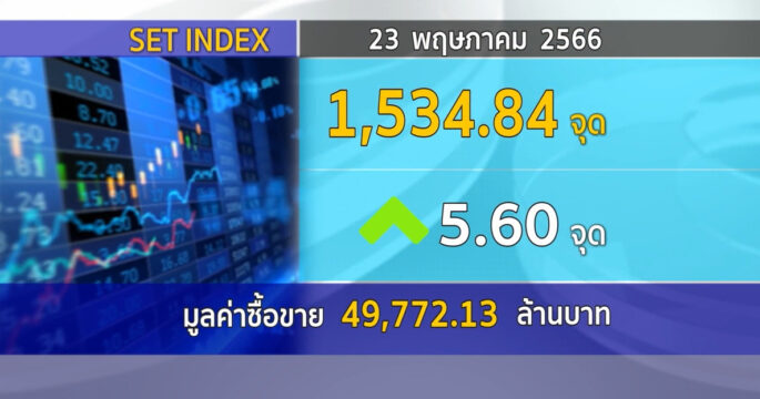 SET ปิดวันนี้ที่ 1,534.84 จุด เพิ่มขึ้น 5.60 จุด (+0.37%) มูลค่าการซื้อขาย 49,772.13 ล้านบาท