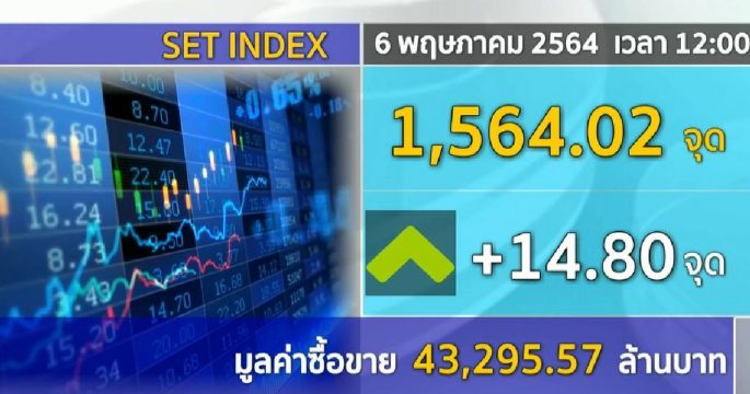 ตลาดหุ้นไทย เปิดตลาดก็บวกขึ้นได้ ดัชนีช่วงเที่ยงอยู่ที่ 1,564.02 จุด เพิ่มขึ้นไป 14.80 จุด มูลค่าซื้อขาย 43,295.57 ล้านบาท