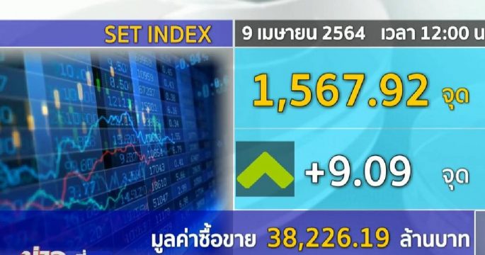 ตลาดหุ้นไทยเปิดตลาดภาคช่วง ปรับขึ้นสูงสุด 11.38 จุด ล่าสุดดัชนีช่วงเที่ยง อยู่ที่ 1,567.92 จุด เพิ่มขึ้น 9.09 จุด มูลค่าซื้อขาย 38,226.19 ล้านบาท