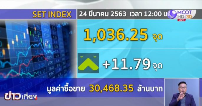 ตลาดหุ้นวันนี้กลับมาบวกได้ ขณะที่ราคาทองพุ่งแรงเพิ่มถึงบาทละ 1,200 บาท ก่อนจะปรับราคาลงเล็กน้อย ขณะที่หุ้นไทยภาคเช้า +11.79 จุด อยู่ที่ 1,036.25 จุด มูลค่าซื้อขาย 30,468.35 ล้านบาท