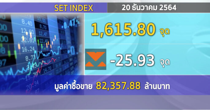 ตลาดหลักทรัพย์ ปิดวันนี้ที่ระดับ 1,615.80 จุด ลดลง 25.93 จุด (-1.58%) มูลค่าการซื้อขาย 82,357.88 ล้านบาท หุ้นไทยวันนี้ปรับตัวลงตามตลาดต่างประเทศ รับ Sentiment เชิงลบจากสถานการณ์โควิดสายพันธุ์โอไมครอน ระบาดในยุโรป