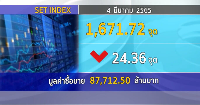 ตลาดหลักทรัพย์ ปิดวันนี้ที่ระดับ 1,671.72 จุด ลดลง 24.36 จุด (-1.44%) มูลค่าการซื้อขาย 87,712.50 ล้านบาท ตลาดหุ้นไทยวันนี้ปรับตัวลงตามตลาดหุ้นต่างประเทศ หลังสถานการณ์รัสเซีย-ยูเครนยืดเยื้อและมีแนวโน้มรุนแรงขึ้น