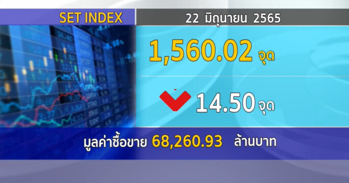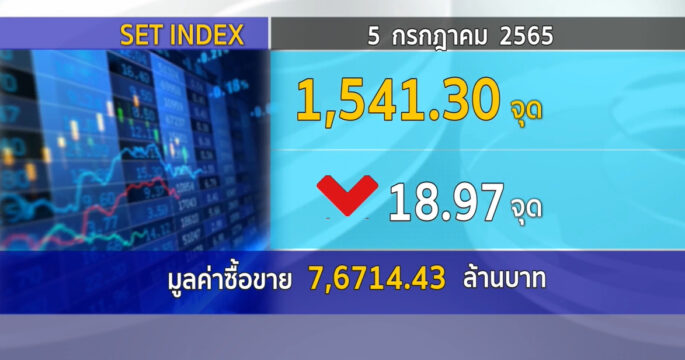 ตลาดหลักทรัพย์ ปิดวันนี้ที่ระดับ 1,541.30 จุด ลดลง 18.97 จุด (-1.22%) มูลค่าการซื้อขาย 76,714.43 ล้านบาท ตลาดหุ้นไทยร่วงต่ำสุดใหม่ของปี กังวลปัจจัยเงินเฟ้อสูง-บาทอ่อนค่า และโควิด-19 กลับมาเร่งตัวขึ้น