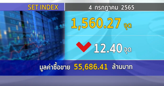ตลาดหลักทรัพย์ ปิดวันนี้ที่ระดับ 1,560.27 จุด ลดลง 12.40 จุด (-0.79%) มูลค่าการซื้อขาย 55,686.41 ล้านบาท กังวลเศรษฐกิจโลกถดถอย