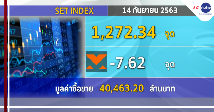 หุ้นไทยปิดวันนี้ (14 ก.ย.) ที่ระดับ 1,272.34 จุด ลดลง 7.62 จุด (0.60%) มูลค่าการซื้อขาย 40,463.20 ล้านบาท