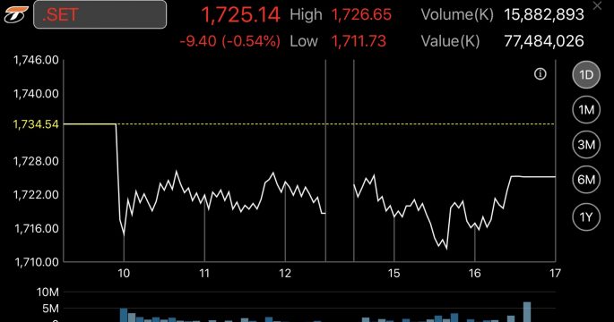 ตลาดหลักทรัพย์ฯ วันนี้ปิดที่ระดับ 1,725.14 จุด ลดลง 9.40 จุด (-0.54 %) มูลค่าการซื้อขาย 77,484.02 ล้านบาท