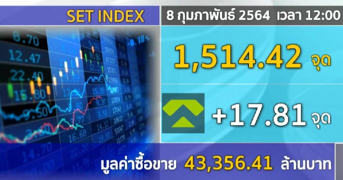 หุ้นไทยภาคเช้าปรับตัวขึ้นตามแรงหนุนจากดัชนีหุ้นตลาดเอเชีย ผลพวงมาตรการกระตุ้นเศรษฐกิจทั่วโลกและราคาน้ำมันดิบที่พุ่งขึ้นสูงสุดในรอบกว่า 1 ปี ช่วงเที่ยงดัชนีอยู่ที่ 1,514.42 จุด บวก 17.81 จุด