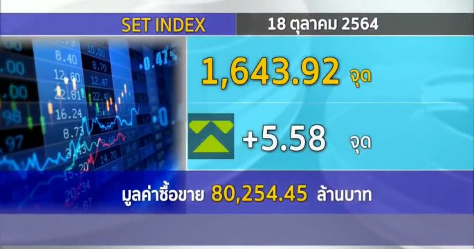 ตลาดหุ้นไทยช่วงเช้า ดัชนีขยับขึ้นตามตลาดหุ้นในภูมิภาคและแรงซื้อหุ้นจากข่าวเปิดเมือง 1 พ.ย. การผ่อนคลายล็อกดาวน์ รวมทั้งราคาน้ำมันที่ยังอยู่ระดับสูง ดัชนีช่วงเที่ยงอยู่ที่ 1,643.14 จุด +2.17 จุด มูลค่าการซื้อขาย 41,146.49 ล้านบาท