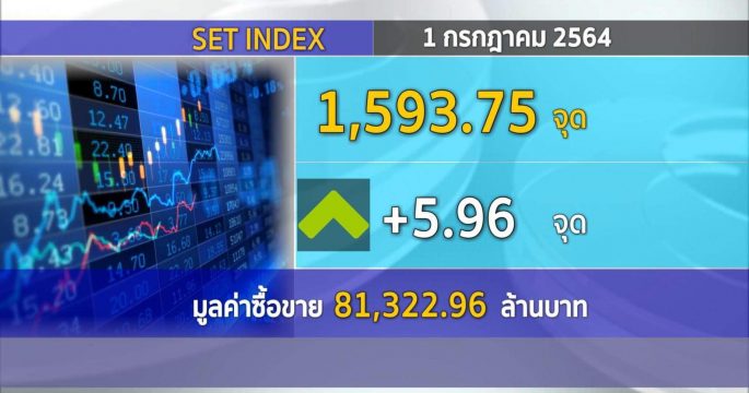 ตลาดหลักทรัพย์ ปิดวันนี้ที่ระดับ 1,593.75 จุด เพิ่มขึ้น 5.96 จุด (+0.38%) มูลค่าการซื้อขาย 81,322.96 ล้านบาท กลุ่มแบงก์หนุนให้น้ำหนักเศรษฐกิจฟื้นมากกว่ากังวลโควิด