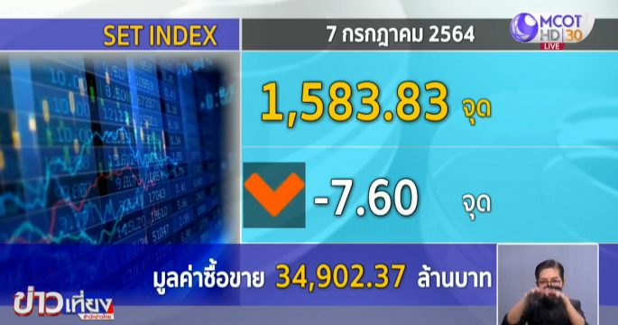 หุ้นไทยเช้านี้ร่วง ล่าสุดเคลื่อนไหวอยู่ที่ 1,583.83 จุด -7.60 จุด มูลค่าการซื้อขาย 34,902.37 ล้านบาท จากปัจจัยลบทั้งต่างประเทศ ราคาน้ำมันร่วง หุ้นหลักของโลกก็ติดลบ ตัวเลขโควิดทั่วโลกยังสูง