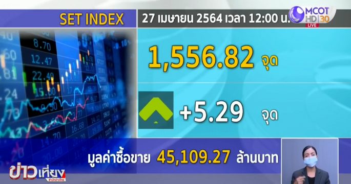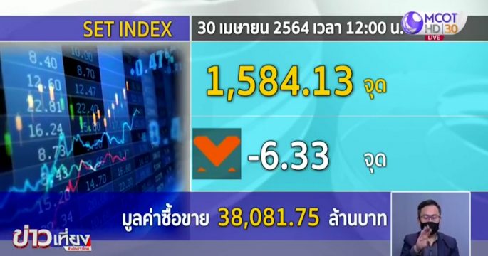 กทม. 30 เม.ย.-ตลาดหลักทรัพย์ปิดวันนี้ที่ระดับ 1,583.13 จุด ลดลง 7.33 จุด (-0.46%) มูลค่าการซื้อขาย 85,480.11 ล้านบาท ตลาดหุ้นไทยปิดทำการ 4 วันติดต่อกัน ทำให้เกิดแรงขายทำกำไรเพื่อลดความเสี่ยง เนื่องจากยังไม่รู้ว่าสถานการณ์โควิด-19 การซื้อขายหุ้นวันนี้ ดัชนีหุ้นไทยเคลื่อนไหวในแดนลบเป็นส่วนใหญ่ โดยดัชนีทำระดับสูงสุด 1,593.23 จุด และระดับต่ำสุด 1,580.74 จุด ส่วนหลักทรัพย์เปลี่ยนแปลงวันนี้ เพิ่มขึ้น 533 หลักทรัพย์ ลดลง 1,051 หลักทรัพย์ และไม่เปลี่ยนแปลง 446 หลักทรัพย์.-สำนักข่าวไทย