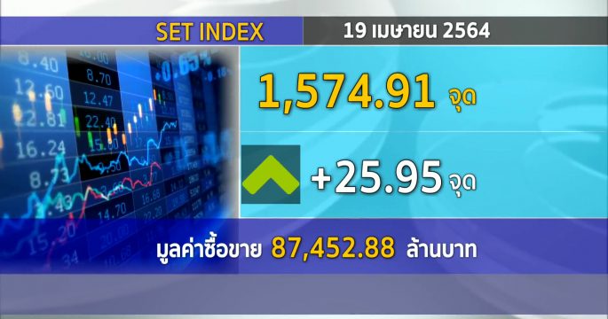 ดัชนีหุ้นไทย ปิดวันนี้ที่ระดับ 1,574.91 จุด เพิ่มขึ้น 25.95 จุด (+1.68%) มูลค่าการซื้อขาย 87,452.88 ล้านบาท หลังตอบรับข่าวโควิดระบาดไปมากแล้ว-ผู้ติดเชื้อวันนี้แผ่วลง