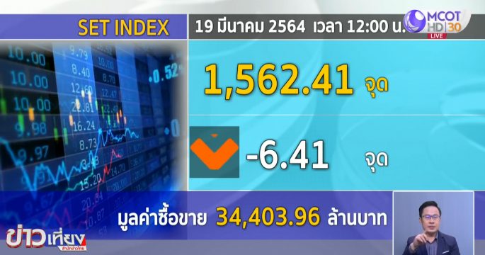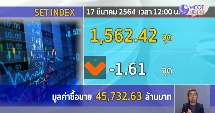 ตลาดหุ้นไทยช่วงเที่ยงเคลื่อนไหวอยู่ที่ 1,562.41 จุด ลดลง -6.41 จุด มูลค่าการซื้อขาย 34,403.96 ล้านบาท
