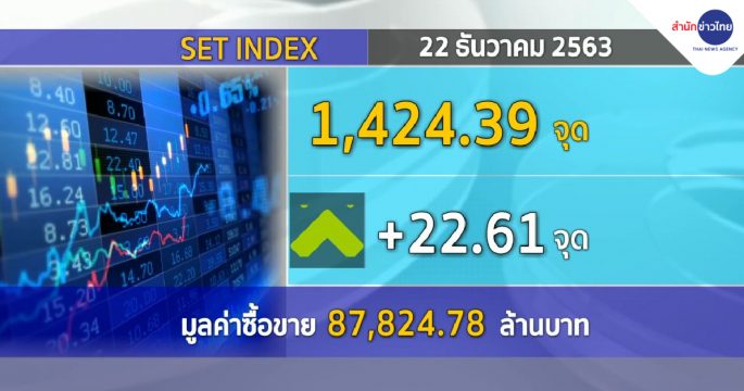 กรุงเทพฯ 22 ธ.ค. – ดัชนีตลาดหุ้นไทยวันนี้ (22 ธ.ค.) ปิดที่ 1,424.39 จุด เพิ่มขึ้น 22.61 จุด มูลค่าการซื้อขาย 87,824.78 ล้านบาท. -สำนักข่าวไทย