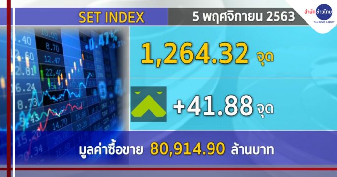 ตลาดหุ้นไทยวันนี้ (5 พ.ย.) ปิดบวกแรง 41.88 จุด ที่ระดับ 1,264.32 จุด มูลค่าการซื้อขาย 80,914.90 ล้านบาท