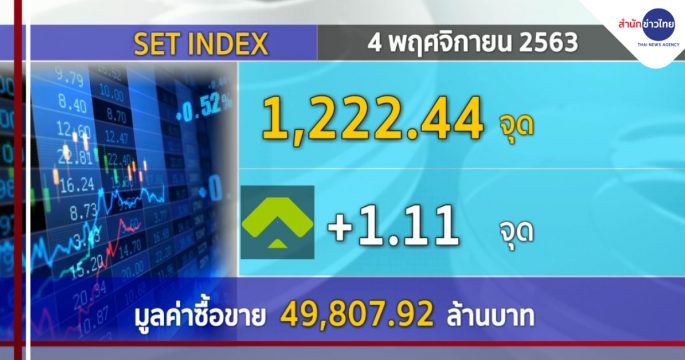ตลาดหุ้นไทยวันนี้ (4 พ.ย.) ปิดบวก 1.11 จุด ที่ระดับ 1,222.44 จุด มูลค่าการซื้อขาย 49,807.92 ล้านบาท
