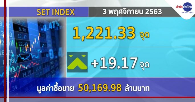 กทม. 3 พ.ย. – ตลาดหุ้นไทยวันนี้ (3 พ.ย.) ปิดบวก 19.17 จุด ที่ระดับ 1,221.33 จุด มูลค่าการซื้อขาย 50,169.98 ล้านบาท .-สำนักข่าวไทย